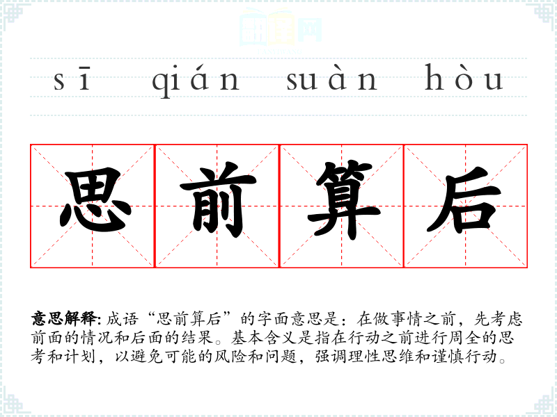 成语“思前算后”的字面意思是:在做事情之前,先考虑前面的情况和后面的结果。基本含义是指在行动之前进行周全的思考和计划,以避免可能的风险和问题,强调理性思维和谨慎行动。
