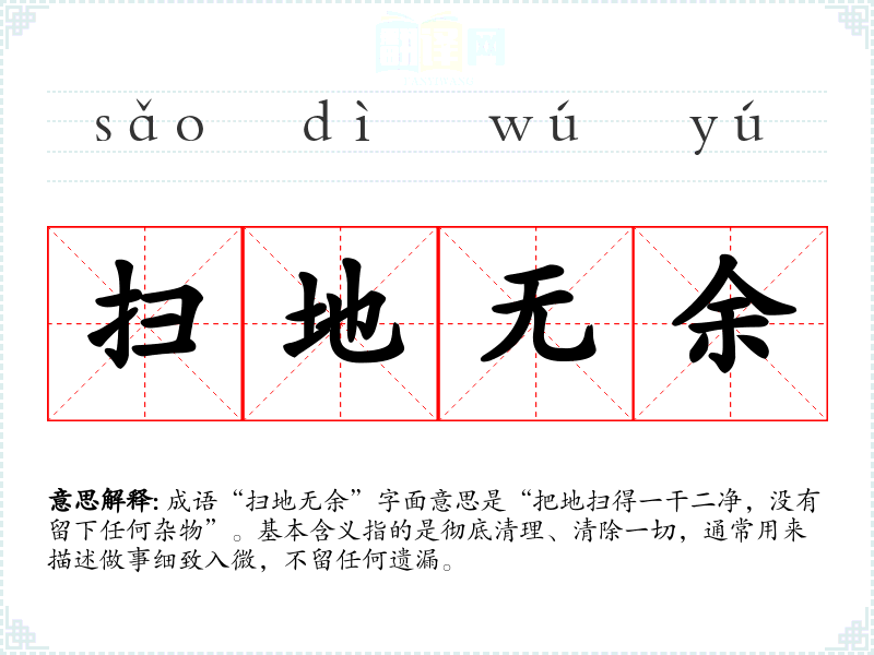 成语“扫地无余”字面意思是“把地扫得一干二净,没有留下任何杂物”。基本含义指的是彻底清理、清除一切,通常用来描述做事细致入微,不留任何遗漏。