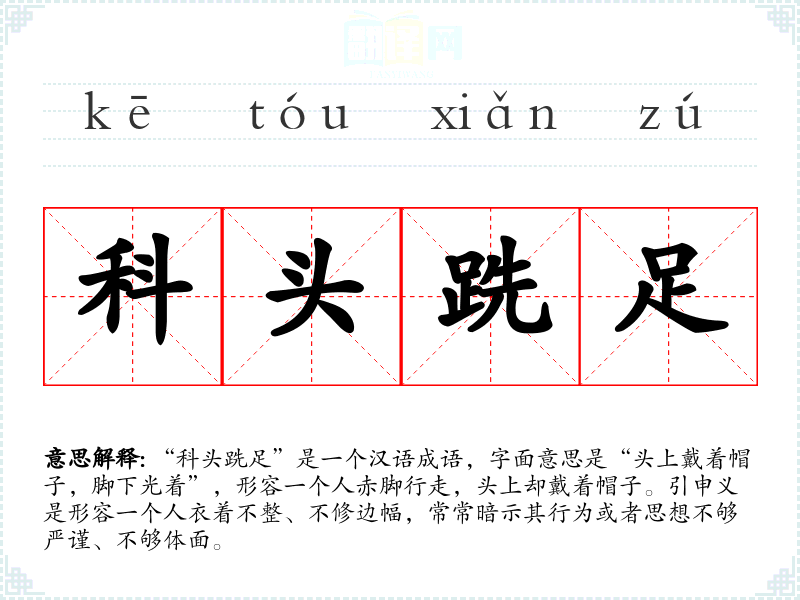 “科头跣足”是一个汉语成语,字面意思是“头上戴着帽子,脚下光着”,形容一个人赤脚行走,头上却戴着帽子。引申义是形容一个人衣着不整、不修边幅,常常暗示其行为或者思想不够严谨、不够体面。