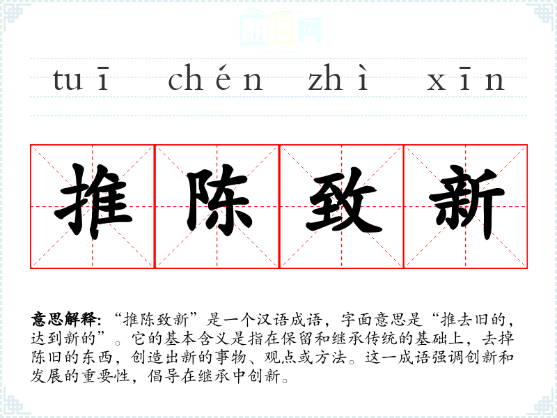 “推陈致新”是一个汉语成语,字面意思是“推去旧的,达到新的”。它的基本含义是指在保留和继承传统的基础上,去掉陈旧的东西,创造出新的事物、观点或方法。这一成语强调创新和发展的重要性,倡导在继承中创新。