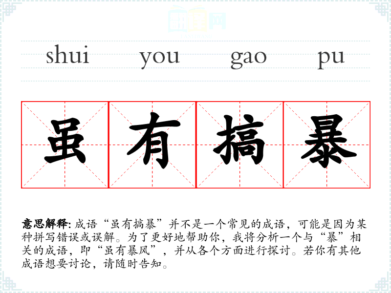 成语“虽有搞暴”并不是一个常见的成语,可能是因为某种拼写错误或误解。为了更好地帮助你,我将分析一个与“暴”相关的成语,即“虽有暴风”,并从各个方面进行探讨。若你有其他成语想要讨论,请随时告知。