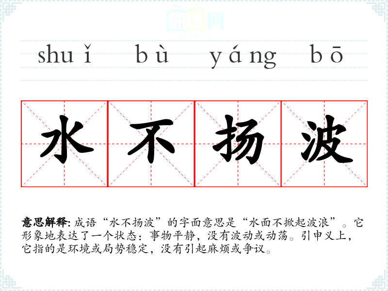 成语“水不扬波”的字面意思是“水面不掀起波浪”。它形象地表达了一个状态:事物平静,没有波动或动荡。引申义上,它指的是环境或局势稳定,没有引起麻烦或争议。
