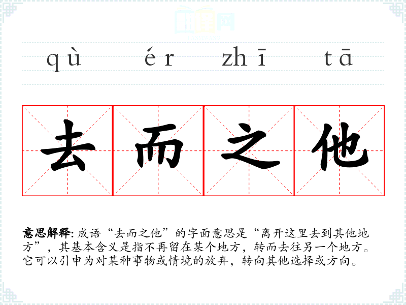 成语“去而之他”的字面意思是“离开这里去到其他地方”,其基本含义是指不再留在某个地方,转而去往另一个地方。它可以引申为对某种事物或情境的放弃,转向其他选择或方向。