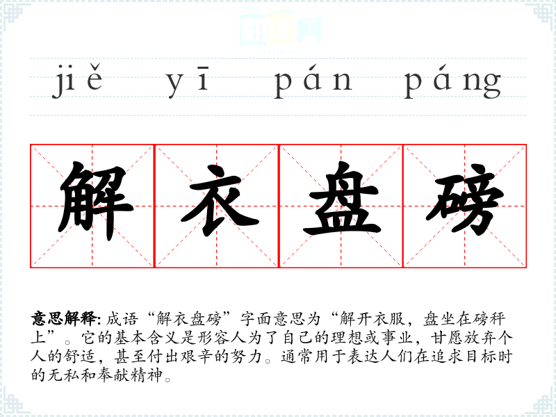 成语“解衣盘磅”字面意思为“解开衣服,盘坐在磅秤上”。它的基本含义是形容人为了自己的理想或事业,甘愿放弃个人的舒适,甚至付出艰辛的努力。通常用于表达人们在追求目标时的无私和奉献精神。