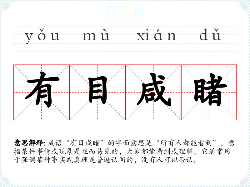 成语“有目咸睹”的字面意思是“所有人都能看到”,意指某件事情或现象是显而易见的,大家都能看到或理解。它通常用于强调某种事实或真理是普遍认同的,没有人可以否认。