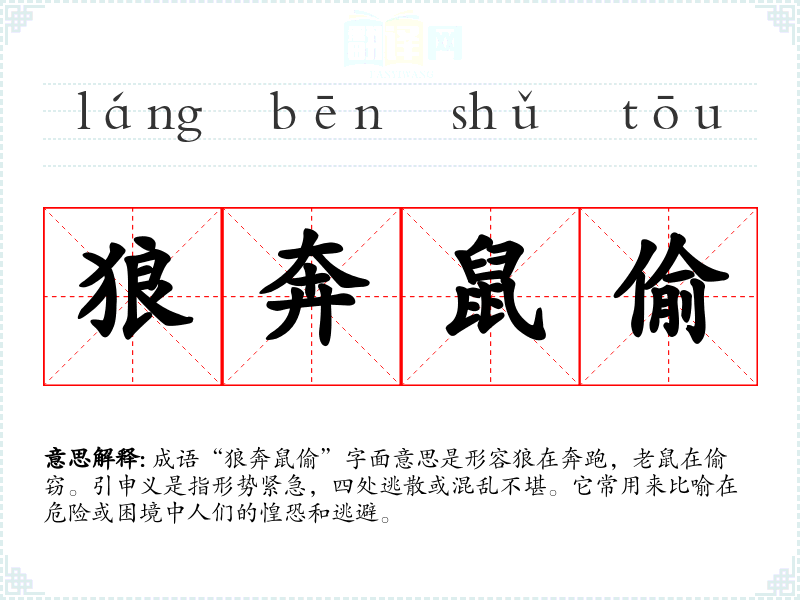成语“狼奔鼠偷”字面意思是形容狼在奔跑,老鼠在偷窃。引申义是指形势紧急,四处逃散或混乱不堪。它常用来比喻在危险或困境中人们的惶恐和逃避。