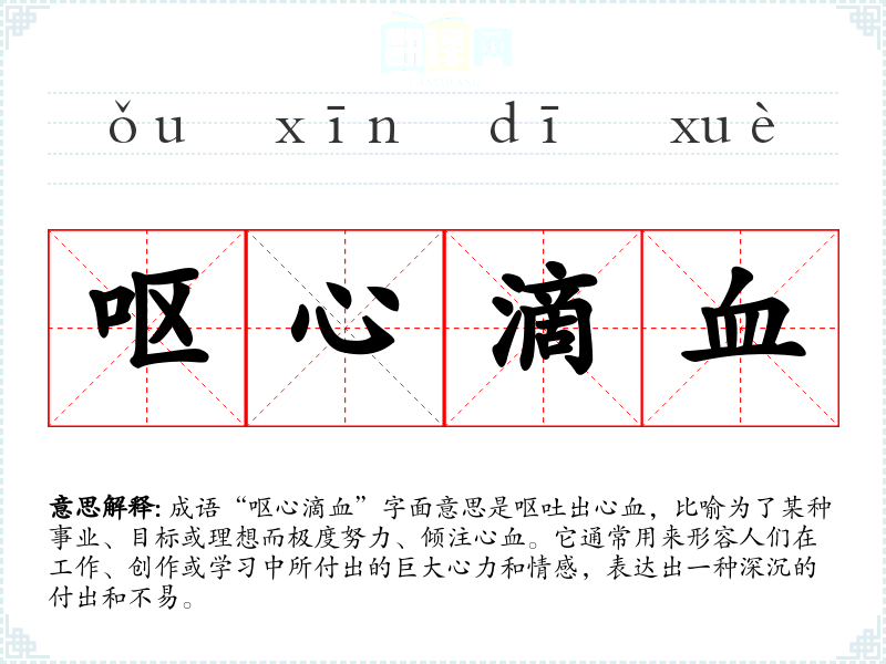 成语“呕心滴血”字面意思是呕吐出心血,比喻为了某种事业、目标或理想而极度努力、倾注心血。它通常用来形容人们在工作、创作或学习中所付出的巨大心力和情感,表达出一种深沉的付出和不易。