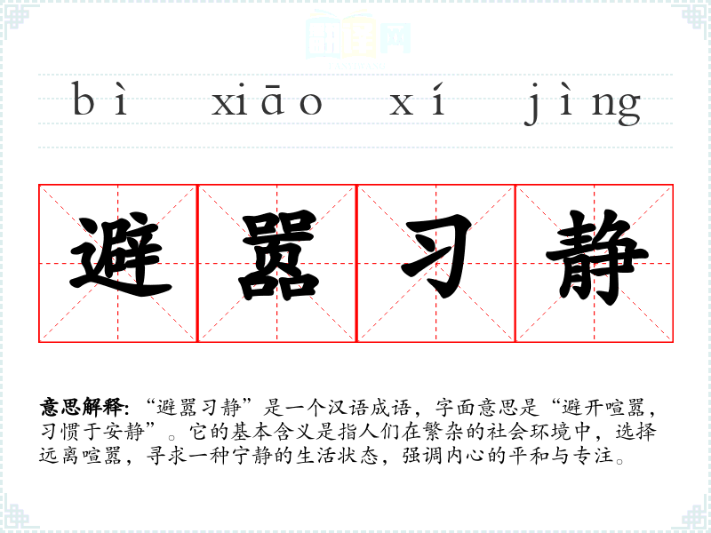 “避嚣习静”是一个汉语成语,字面意思是“避开喧嚣,习惯于安静”。它的基本含义是指人们在繁杂的社会环境中,选择远离喧嚣,寻求一种宁静的生活状态,强调内心的平和与专注。