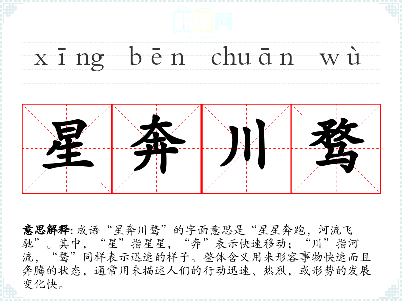 成语“星奔川骛”的字面意思是“星星奔跑,河流飞驰”。其中,“星”指星星,“奔”表示快速移动;“川”指河流,“骛”同样表示迅速的样子。整体含义用来形容事物快速而且奔腾的状态,通常用来描述人们的行动迅速、热烈,或形势的发展变化快。