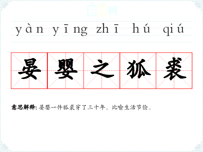 | 晏婴之狐裘 | 晏婴一件狐裘穿了三十年。比喻生活节俭。 |