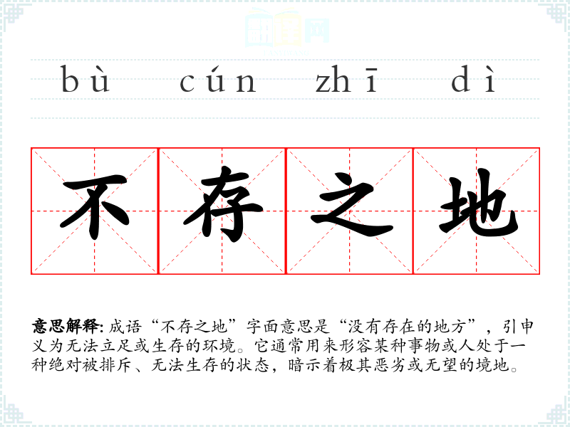 成语“不存之地”字面意思是“没有存在的地方”,引申义为无法立足或生存的环境。它通常用来形容某种事物或人处于一种绝对被排斥、无法生存的状态,暗示着极其恶劣或无望的境地。
