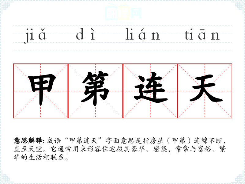 成语“甲第连天”字面意思是指房屋(甲第)连绵不断,直至天空。它通常用来形容住宅极其豪华、密集,常常与富裕、繁华的生活相联系。
