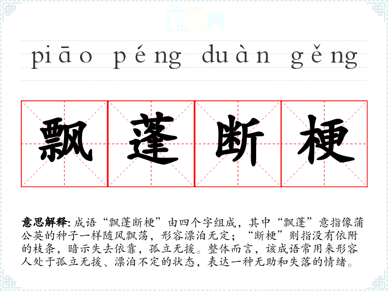 成语“飘蓬断梗”由四个字组成,其中“飘蓬”意指像蒲公英的种子一样随风飘荡,形容漂泊无定;“断梗”则指没有依附的枝条,暗示失去依靠,孤立无援。整体而言,该成语常用来形容人处于孤立无援、漂泊不定的状态,表达一种无助和失落的情绪。