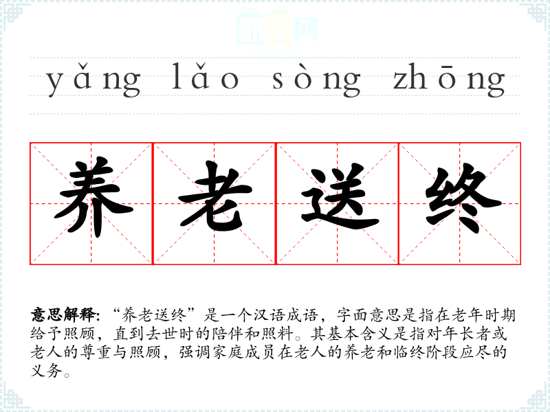 | 养老送终 | 指子女对父母身前的赡养和死后的殡葬。 |
