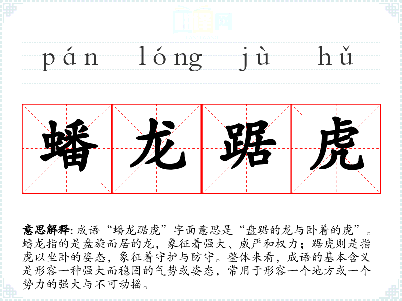 成语“蟠龙踞虎”字面意思是“盘踞的龙与卧着的虎”。蟠龙指的是盘旋而居的龙,象征着强大、威严和权力;踞虎则是指虎以坐卧的姿态,象征着守护与防守。整体来看,成语的基本含义是形容一种强大而稳固的气势或姿态,常用于形容一个地方或一个势力的强大与不可动摇。