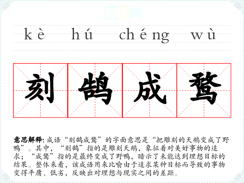 成语“刻鹄成鹜”的字面意思是“把雕刻的天鹅变成了野鸭”。其中,“刻鹄”指的是雕刻天鹅,象征着对美好事物的追求;“成鹜”指的是最终变成了野鸭,暗示了未能达到理想目标的结果。整体来看,该成语用来比喻由于追求某种目标而导致的事物变得平庸、低劣,反映出对理想与现实之间的差距。