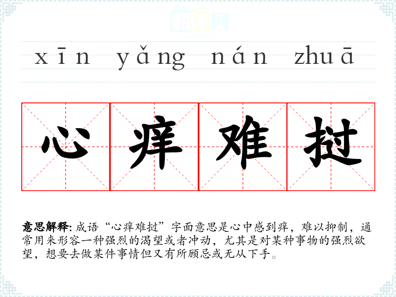 成语“心痒难挝”字面意思是心中感到痒,难以抑制,通常用来形容一种强烈的渴望或者冲动,尤其是对某种事物的强烈欲望,想要去做某件事情但又有所顾忌或无从下手。
