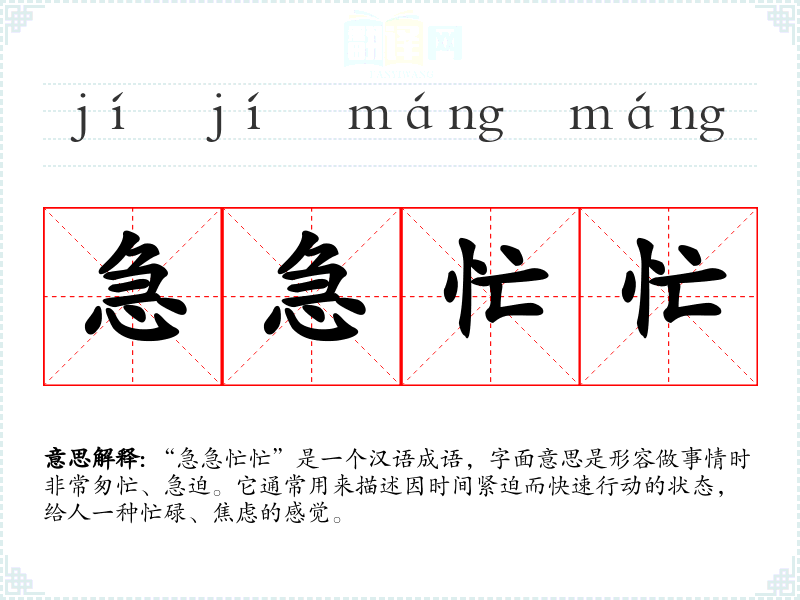 “急急忙忙”是一个汉语成语,字面意思是形容做事情时非常匆忙、急迫。它通常用来描述因时间紧迫而快速行动的状态,给人一种忙碌、焦虑的感觉。