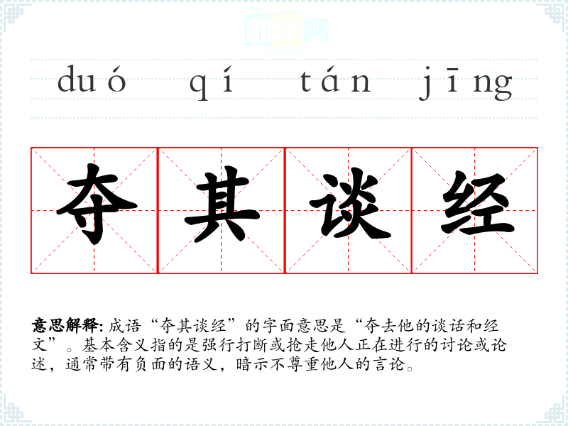 成语“夺其谈经”的字面意思是“夺去他的谈话和经文”。基本含义指的是强行打断或抢走他人正在进行的讨论或论述,通常带有负面的语义,暗示不尊重他人的言论。