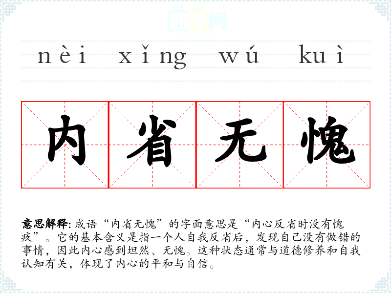 成语“内省无愧”的字面意思是“内心反省时没有愧疚”。它的基本含义是指一个人自我反省后,发现自己没有做错的事情,因此内心感到坦然、无愧。这种状态通常与道德修养和自我认知有关,体现了内心的平和与自信。