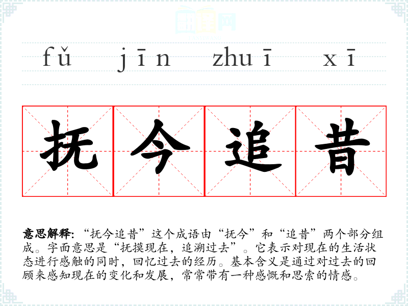 “抚今追昔”这个成语由“抚今”和“追昔”两个部分组成。字面意思是“抚摸现在,追溯过去”。它表示对现在的生活状态进行感触的同时,回忆过去的经历。基本含义是通过对过去的回顾来感知现在的变化和发展,常常带有一种感慨和思索的情感。