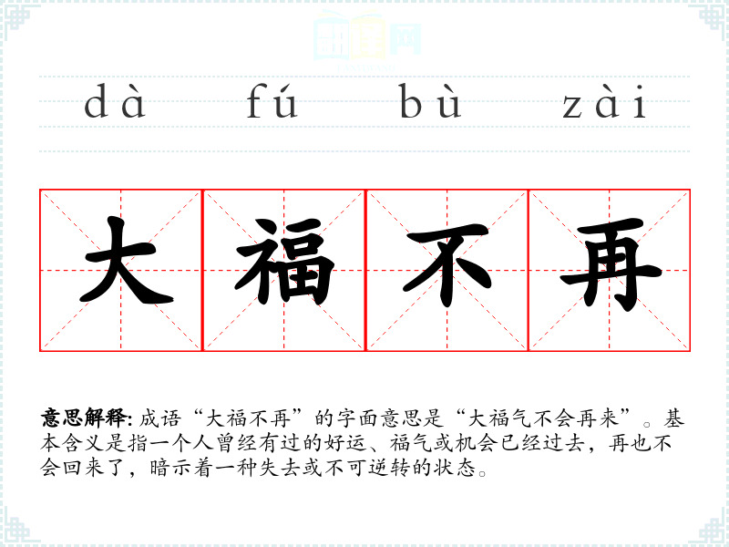 - 反义成语:如“福星高照”,意味着好运连连,与“大福不再”形成鲜明对比。