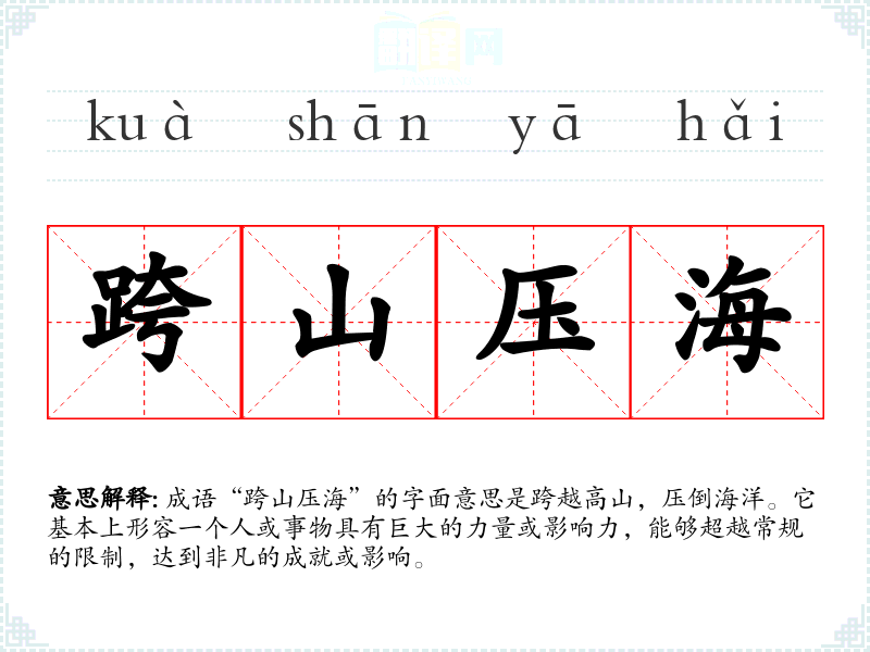 在**文化中,山和海都是自然界的伟大象征,跨越它们意味着征服自然、超越自我。因此,“跨山压海”不仅表达了对个人能力的赞美,也反映了对奋斗精神和不屈不挠的追求的崇尚。在现代社会,这个成语依然适用于强调创新、奋斗和追求卓越的背景。