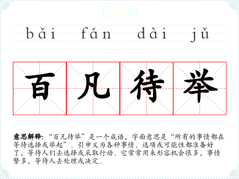“百凡待举”是一个成语,字面意思是“所有的事情都在等待选择或举起”。引申义为各种事情、选项或可能性都准备好了,等待人们去选择或采取行动。它常常用来形容机会很多,事情繁多,等待人去处理或决定。