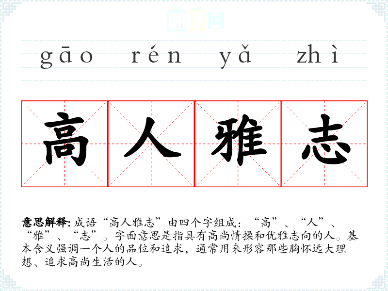 成语“高人雅志”由四个字组成:“高”、“人”、“雅”、“志”。字面意思是指具有高尚情操和优雅志向的人。基本含义强调一个人的品位和追求,通常用来形容那些胸怀远大理想、追求高尚生活的人。