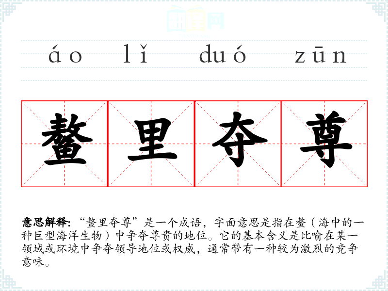 “鳌里夺尊”是一个成语,字面意思是指在鳌(海中的一种巨型海洋生物)中争夺尊贵的地位。它的基本含义是比喻在某一领域或环境中争夺领导地位或权威,通常带有一种较为激烈的竞争意味。