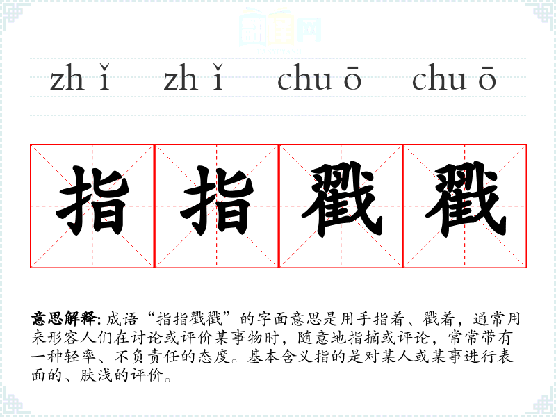 成语“指指戳戳”的字面意思是用手指着、戳着,通常用来形容人们在讨论或评价某事物时,随意地指摘或评论,常常带有一种轻率、不负责任的态度。基本含义指的是对某人或某事进行表面的、肤浅的评价。