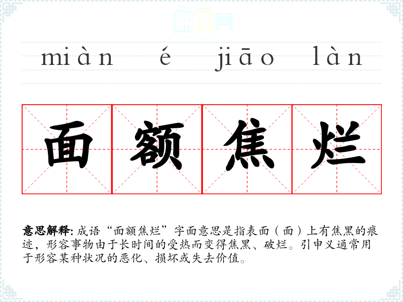 成语“面额焦烂”字面意思是指表面(面)上有焦黑的痕迹,形容事物由于长时间的受热而变得焦黑、破烂。引申义通常用于形容某种状况的恶化、损坏或失去价值。