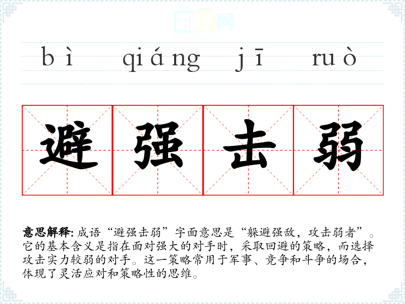 成语“避强击弱”字面意思是“躲避强敌,攻击弱者”。它的基本含义是指在面对强大的对手时,采取回避的策略,而选择攻击实力较弱的对手。这一策略常用于军事、竞争和斗争的场合,体现了灵活应对和策略性的思维。