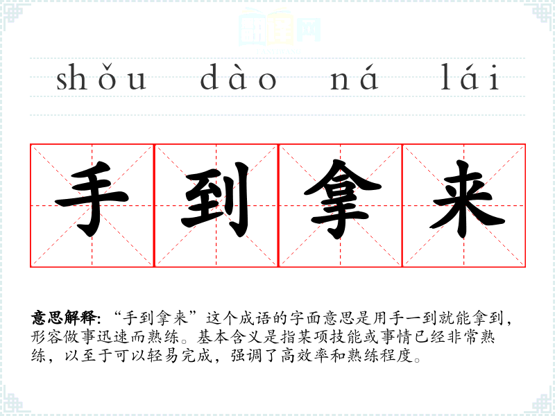 “手到拿来”这个成语的字面意思是用手一到就能拿到,形容做事迅速而熟练。基本含义是指某项技能或事情已经非常熟练,以至于可以轻易完成,强调了高效率和熟练程度。