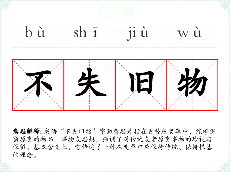 - 文学作品:作家在描写人物或社会变迁时,可能会提到“不失旧物”,以表现对传统的尊重。