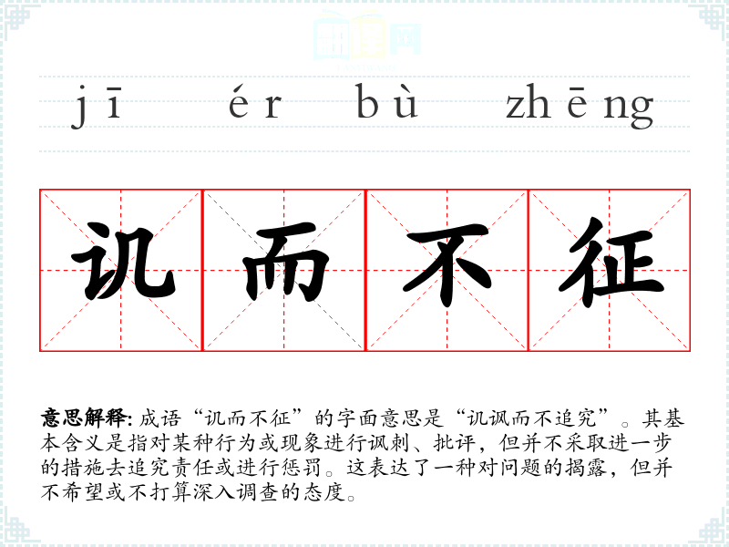 成语“讥而不征”的字面意思是“讥讽而不追究”。其基本含义是指对某种行为或现象进行讽刺、批评,但并不采取进一步的措施去追究责任或进行惩罚。这表达了一种对问题的揭露,但并不希望或不打算深入调查的态度。