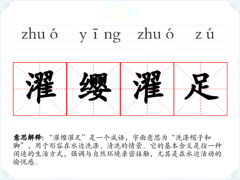 “濯缨濯足”是一个成语,字面意思为“洗涤帽子和脚”,用于形容在水边洗涤、清洗的情景。它的基本含义是指一种闲适的生活方式,强调与自然环境亲密接触,尤其是在水边活动的愉悦感。