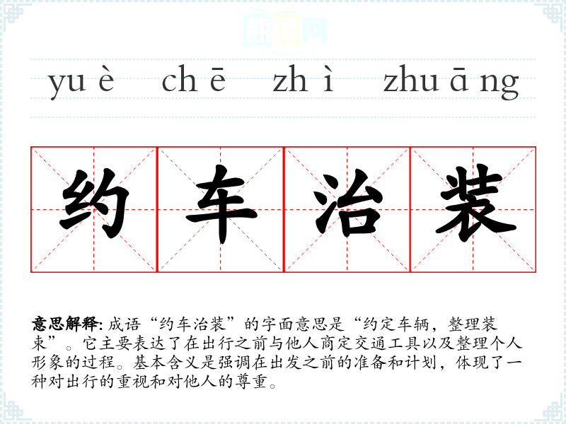成语“约车治装”的字面意思是“约定车辆,整理装束”。它主要表达了在出行之前与他人商定交通工具以及整理个人形象的过程。基本含义是强调在出发之前的准备和计划,体现了一种对出行的重视和对他人的尊重。