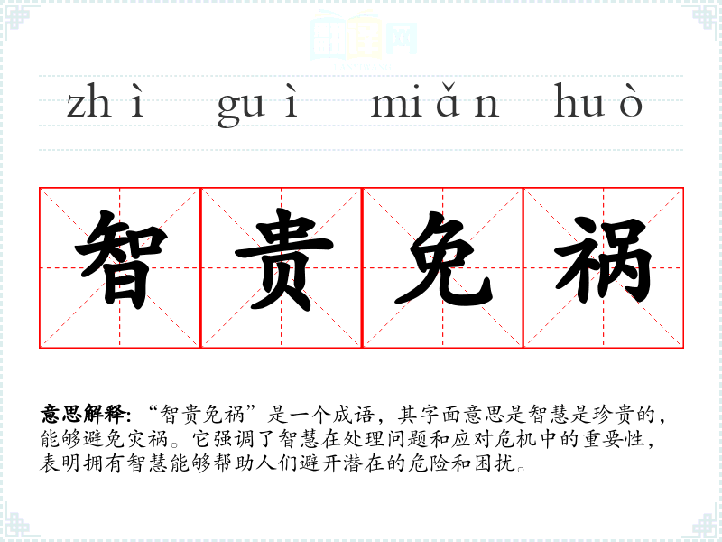 “智贵免祸”是一个成语,其字面意思是智慧是珍贵的,能够避免灾祸。它强调了智慧在处理问题和应对危机中的重要性,表明拥有智慧能够帮助人们避开潜在的危险和困扰。