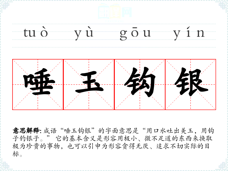 成语“唾玉钩银”的字面意思是“用口水吐出美玉,用钩子钓银子。” 它的基本含义是形容用极小、微不足道的东西来换取极为珍贵的事物,也可以引申为形容贪得无厌、追求不切实际的目标。