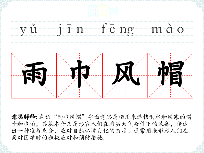 成语“雨巾风帽”字面意思是指用来遮挡雨水和风寒的帽子和巾帕。其基本含义是形容人们在恶劣天气条件下的装备,传达出一种准备充分、应对自然环境变化的态度。通常用来形容人们在面对困难时的积极应对和预防措施。