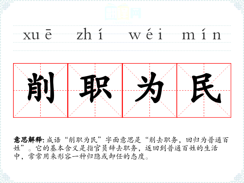 成语“削职为民”字面意思是“削去职务,回归为普通百姓”。它的基本含义是指官员辞去职务,返回到普通百姓的生活中,常常用来形容一种归隐或卸任的态度。