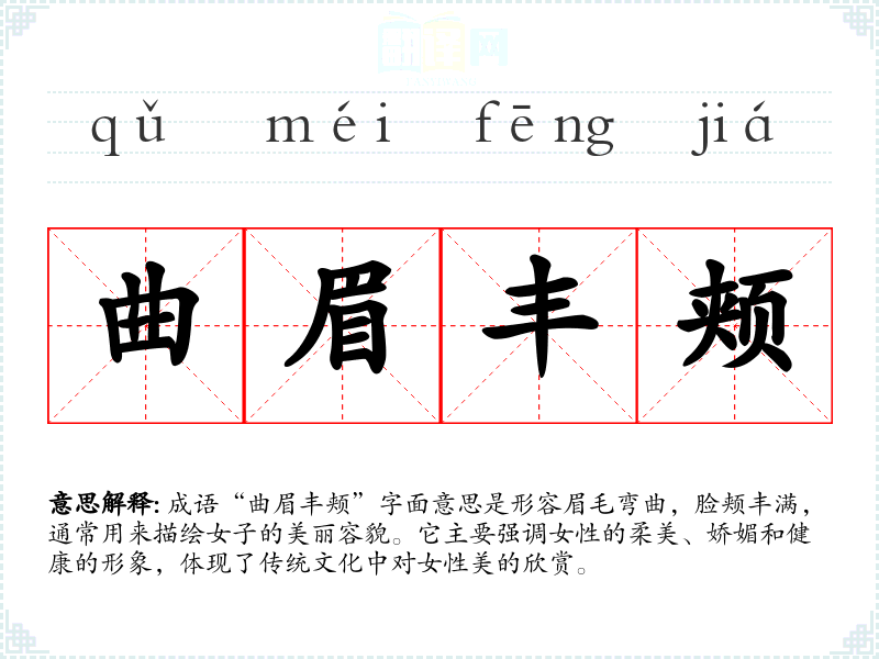 “曲眉丰颊”这个成语源于古代文学,具体出处并不明确,但可以推测与古代诗词中的描写有关。古代诗人常通过细腻的笔触描绘女子的容貌特征,以表达对美的赞美和对女性的柔情。例如,《红楼梦》中对女性角色的描写,常常强调她们的眉目和面容,体现了这一成语的核心意涵。