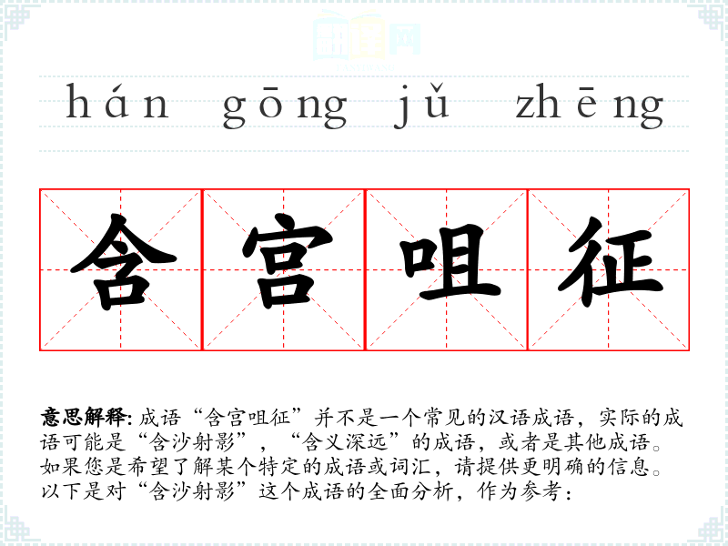 成语“含宫咀征”并不是一个常见的汉语成语,实际的成语可能是“含沙射影”,“含义深远”的成语,或者是其他成语。如果您是希望了解某个特定的成语或词汇,请提供更明确的信息。以下是对“含沙射影”这个成语的全面分析,作为参考: