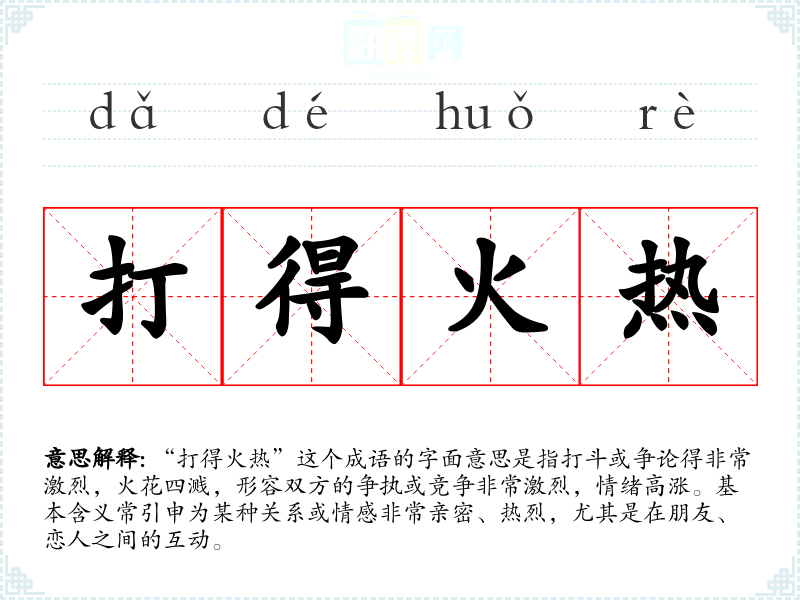 “打得火热”这个成语的字面意思是指打斗或争论得非常激烈,火花四溅,形容双方的争执或竞争非常激烈,情绪高涨。基本含义常引申为某种关系或情感非常亲密、热烈,尤其是在朋友、恋人之间的互动。