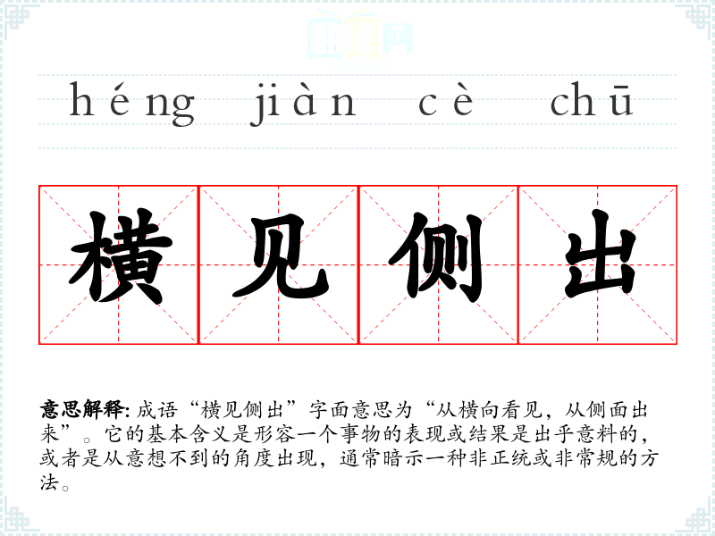 成语“横见侧出”字面意思为“从横向看见,从侧面出来”。它的基本含义是形容一个事物的表现或结果是出乎意料的,或者是从意想不到的角度出现,通常暗示一种非正统或非常规的方法。
