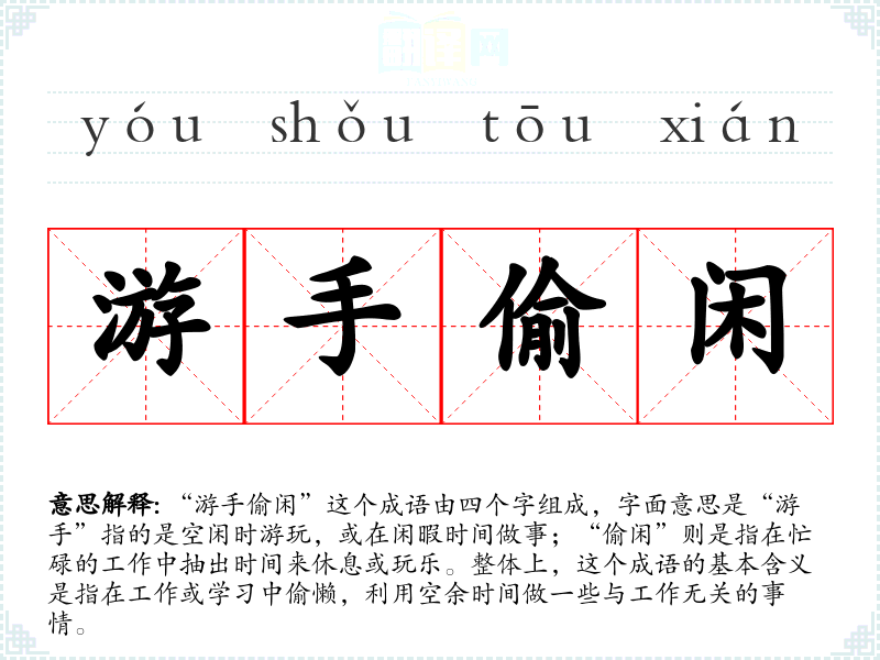 “游手偷闲”这个成语由四个字组成,字面意思是“游手”指的是空闲时游玩,或在闲暇时间做事;“偷闲”则是指在忙碌的工作中抽出时间来休息或玩乐。整体上,这个成语的基本含义是指在工作或学*中偷懒,利用空余时间做一些与工作无关的事情。
