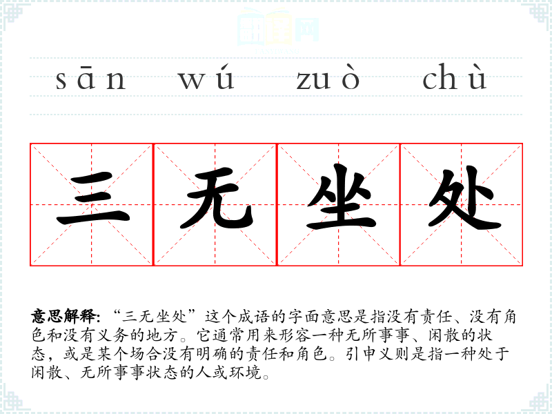 “三无坐处”这个成语的字面意思是指没有责任、没有角色和没有义务的地方。它通常用来形容一种无所事事、闲散的状态,或是某个场合没有明确的责任和角色。引申义则是指一种处于闲散、无所事事状态的人或环境。