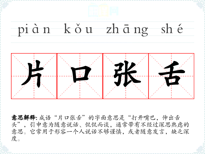 成语“片口张舌”的字面意思是“打开嘴巴,伸出舌头”,引申意为随意说话、侃侃而谈,通常带有不经过深思熟虑的意思。它常用于形容一个人说话不够谨慎,或者随意发言,缺乏深度。