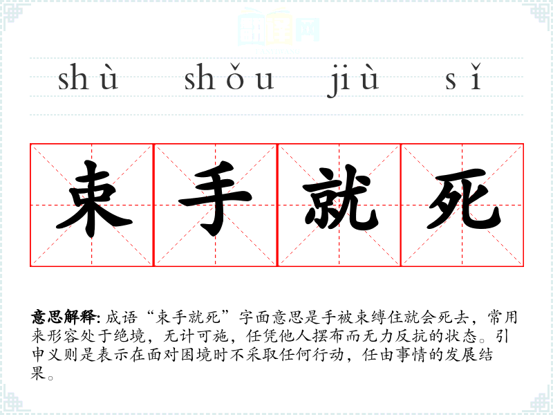 成语“束手就死”字面意思是手被束缚住就会死去,常用来形容处于绝境,无计可施,任凭他人摆布而无力反抗的状态。引申义则是表示在面对困境时不采取任何行动,任由事情的发展结果。